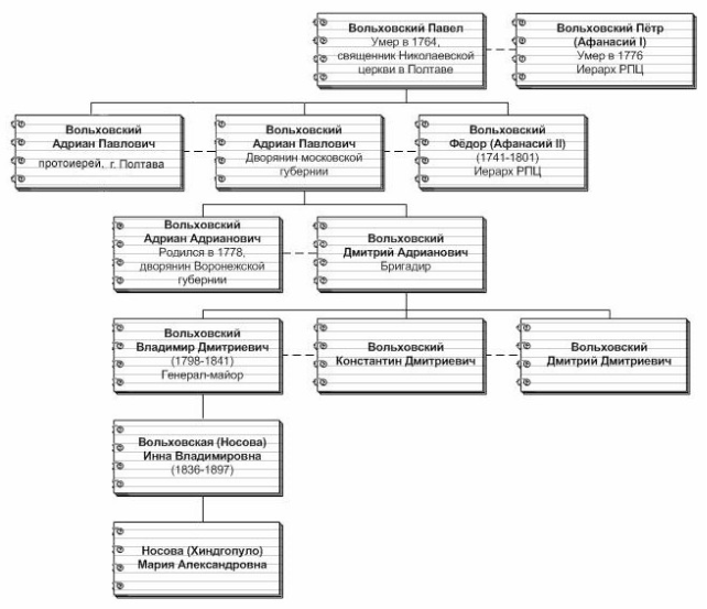 А разгадка таилась в ремарке, которую автор делает в самом конце: «вследствие недосмотра не попало на своё место примечание об епископе Вольховском II, 1741 года рождения, уроженце г. Полтавы. Отец его, Павел, был священником при Николаевской церкви в Полтаве». Это уже намного ближе. Семья лицеиста и иерархи – не только однофамильцы, но и земляки. Дальше – еще интереснее. Биограф пишет, что Афанасий Вольховский II умер у своего брата Андрея – протоиерея Полтавской Николаевской церкви. Наследниками преосвященного Афанасия по мужской линии стали брат Андрей Вольховский и племянники, а также дети второго брата – Адриана Павловича Вольховского. Последняя фраза – недостающее звено в родословной. Мы узнали отчество деда Владимира Вольховского – Адриан Павлович. Он – родной брат умершего в Полтаве епископа Могилёвского и Полоцкого Афанасия II. Отец Адриана и Афанасия II – полтавский священник Павел – прадед лицеиста. А епископ Афанасий I, член Св. Синода – брат его прадеда.